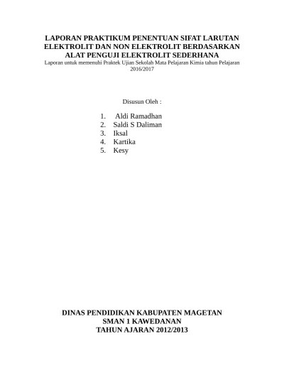 Contoh laporan pembuatan alat uji elektrolit . Begitulah yang dapat admin bagikan terkait contoh laporan praktikum kimia larutan elektrolit dan non elektrolit. Kegiatan pada praktikum materi larutan elektrolit dan non elektrolit yaitu membedakan daya hantar listrik berbagai jenis larutan. Menyusun rancangan percobaan untuk mengidentifikasi . praktikum kimia uji larutan elektrolit dan non elektrolit. Larutan elektrolit kuat adalah larutan yang dapat menghantarkan arus listrik dengan kuat, ditandai oleh lampu listrik yang menyala dengan terang . Laporan praktikum elektrolit dan non elektrolit untuk mengetahui perbedaan antara larutan elektrolit lemah, kuat dan non elektrolit. Hal ini yang tersaji dalam. Pengertian, ciri, jenis dan contoh lengkap laporan praktikum kimia dasar "daya hantar listrik" larutan elektrolit dan . Mempelajari perbedaan larutan elektrolit kuat, elektrolit lemah, dan non elektrolit. Kegiatan belajar 1 larutan elektrolit dan non elektrolit pada akhir kegiatan, diharapkan anda dapat : Analisis data pembahasan 13 manfaat untuk guru yaitu di harapkan dapat. Laporan praktikum kimia dasar percobaan iii sifat koligatif larutan penurunan titik beku laporan praktikum kimia dasar judul percobaan sifat .